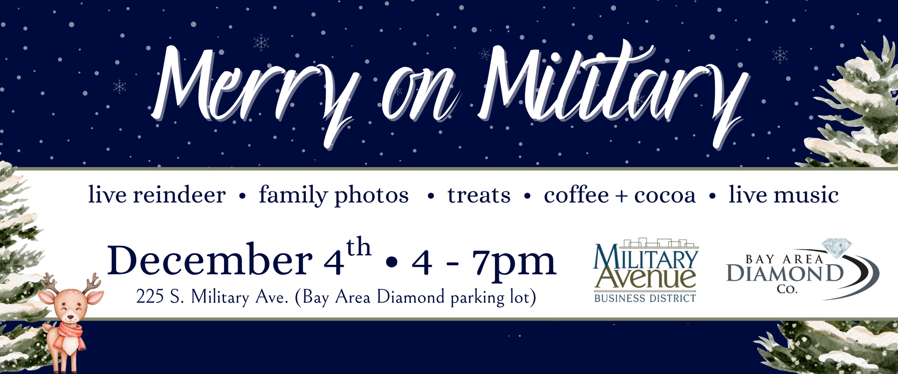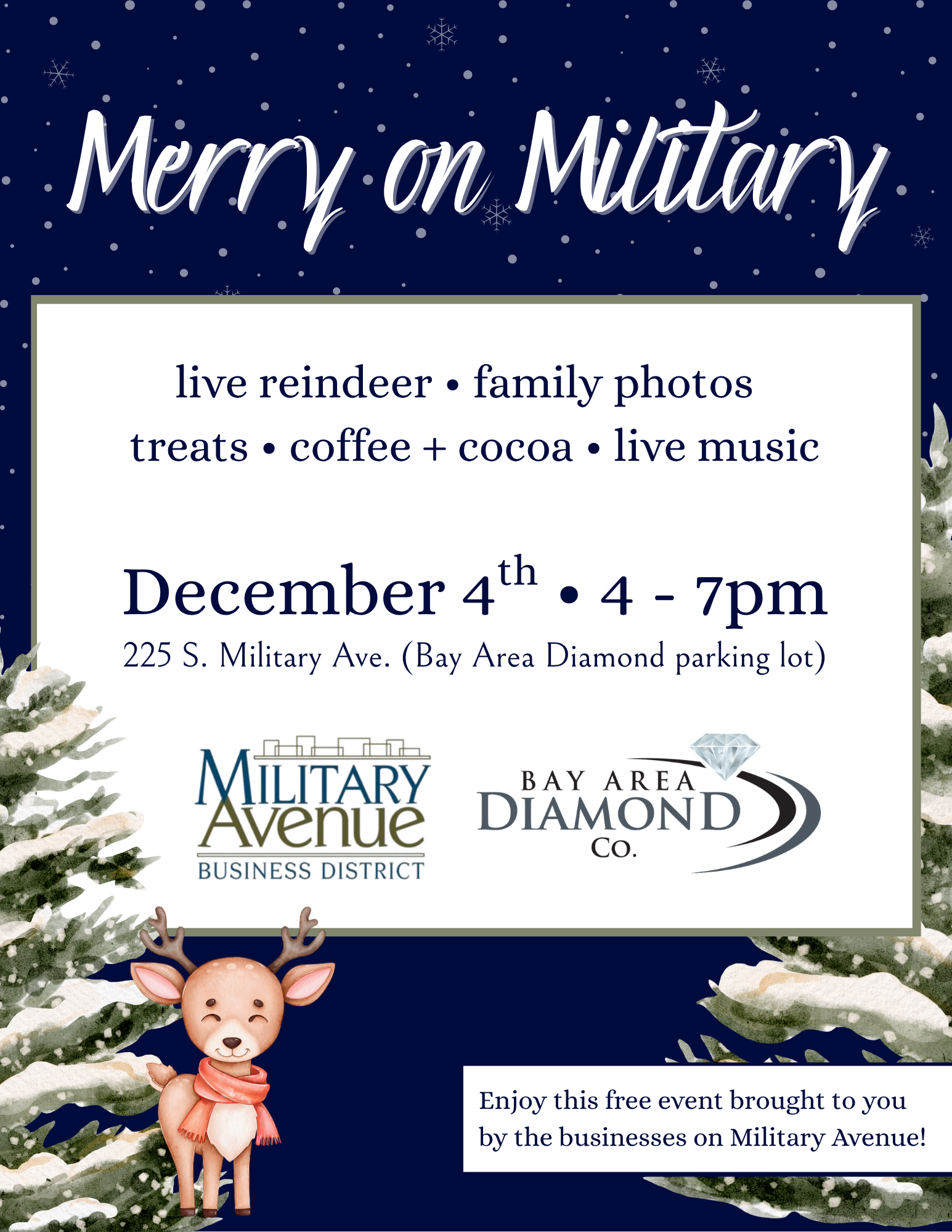 Join the Military Avenue Business Association for our first-ever “Merry on Military” holiday celebration on Thursday, December 4th, from 4–7 PM, located in the Bay Area Diamond Company parking lot (225 S. Military Ave.). Experience the magic of the season with live reindeer from The Aurora Acres and their enchanting sleigh, available for a complimentary family photoshoot. Each family will receive 2–3 professionally edited digital images, courtesy of Bay Area Diamond Company. Enjoy festive live music, s’mores and sweet treats, hot chocolate and coffee, a reindeer-themed craft station, and special goodies for your furry friends yes, dogs are invited! We’ll also be collecting wish list donations for House of Hope to support local families in need. This heartwarming event is made possible by the generous support of local Military Avenue businesses. Come celebrate the holidays with us and enjoy the festive spirit of our Green Bay community!